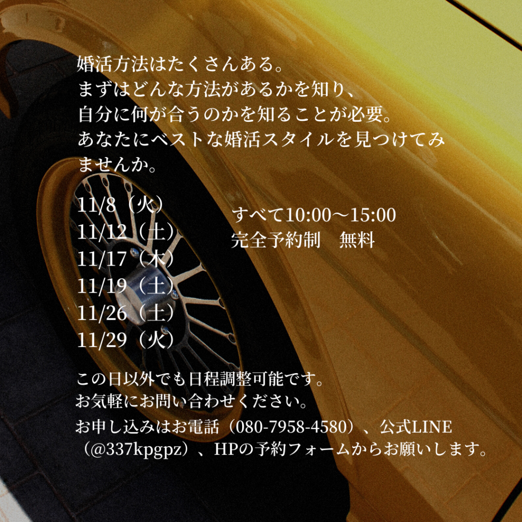 ニュース11月の『男性の婚活』2022.10.3011月の『男性の婚活』の日程です。そろそろ本気で結婚相手を探すとき、どうしていますか?疑いながらもとりあえずアプリ登録?一度に会えるしパーティー参加?結婚に本気の女性ってどこで会えるんだ?分からないから、、とりあえず飲みに行こう!……分からないなら、とりあえずKa pilinaに来てみませんか?お話を聞く中で、あなたに合う婚活方法を見つけます。無料の婚活相談に来て、そこから始めましょう。 プロフィール写真撮影について前の記事 11月の『女性の婚活』次の記事